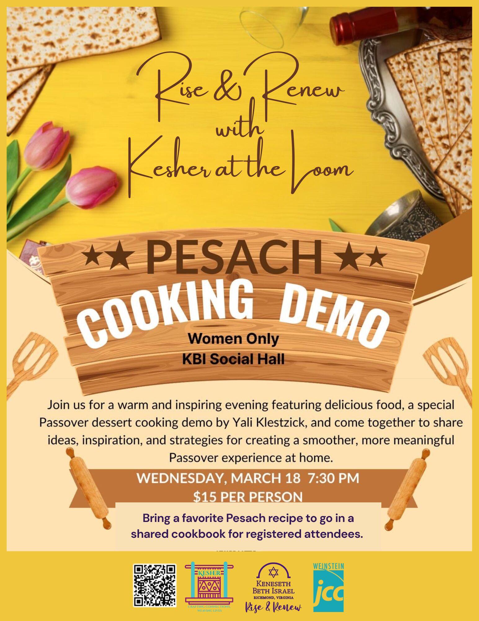 Enjoy delicious bites and a Passover dessert cooking demonstration by Yali Klestzick, followed by a collaborative discussion where we’ll share practical ideas, helpful tips, and creative inspiration to make Passover easier, more meaningful, and more joyful for our families.